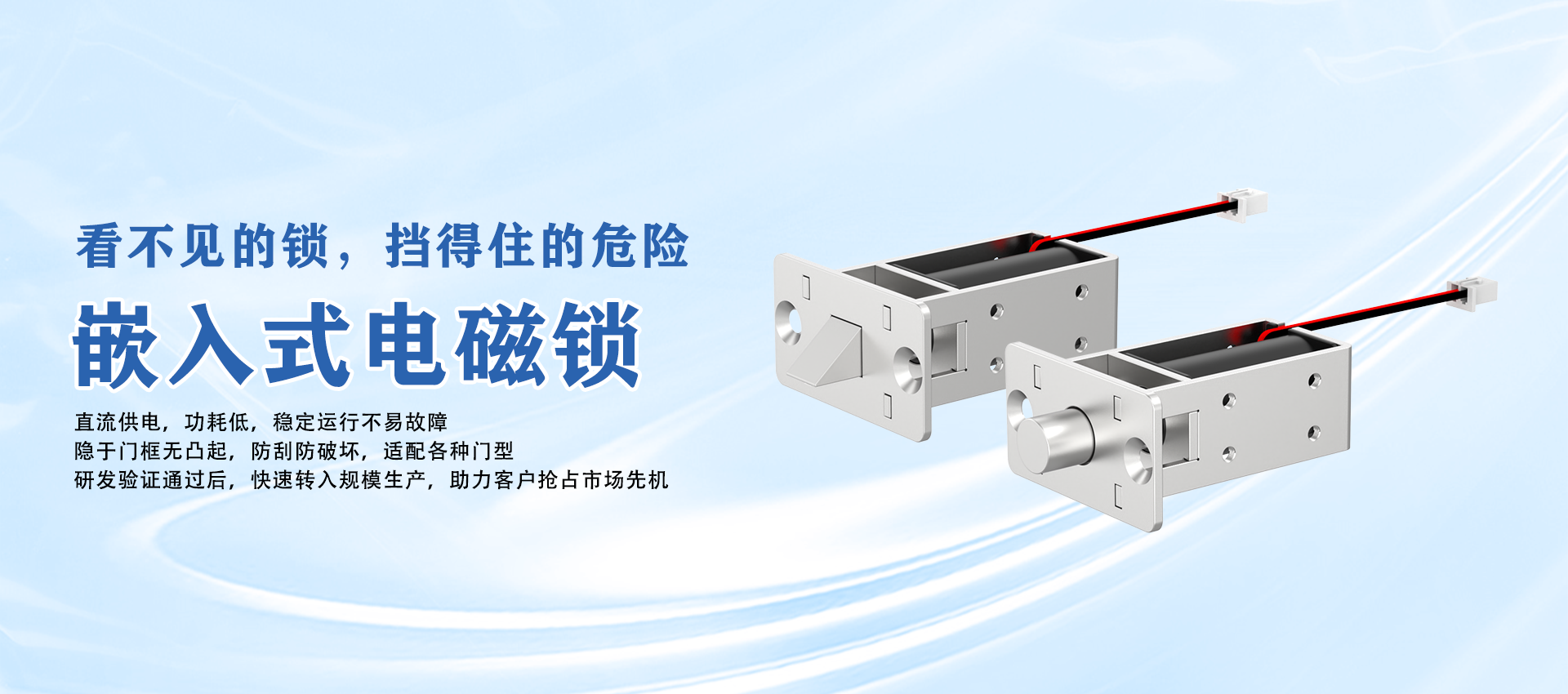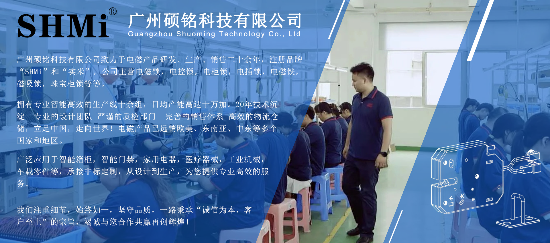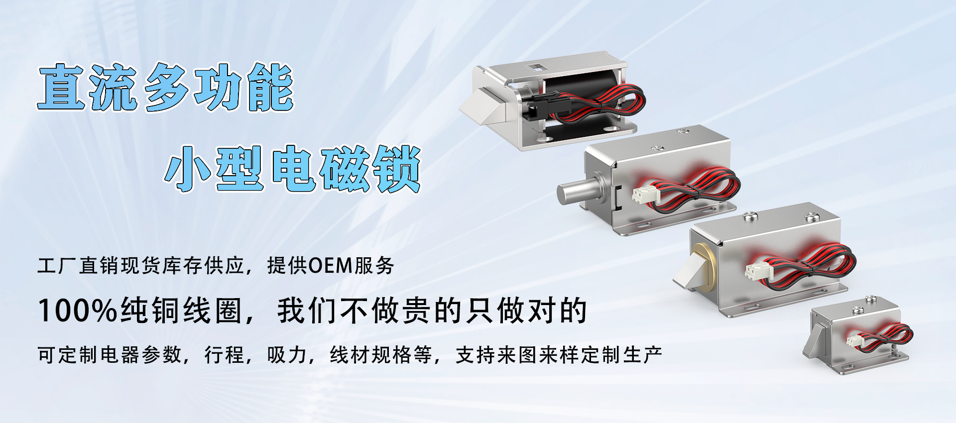 本公司是一家研发,生产与销售一体的高新科技企业,专业研发生产各类正标,非标电磁铁,电磁阀,电磁锁,电控锁,电机锁,电插锁,磁力锁,螺线管,电磁控制器等近千款产品。